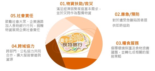 (一)落實臺中市愛心食物銀行體系,整合公私部門資源,提供弱勢家庭即時且適切之生活協助,確保市民基本生活需求,強化社會安全網。