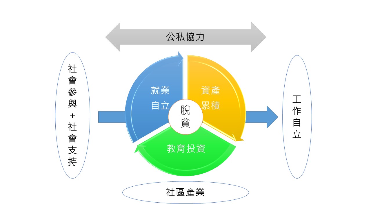 (二)運用資產累積、教育投資、就業自立、社會參與、社區產業5大策略,依服務對象之就業意願、能力及使用者需求規劃,分階分流提供多元適切脫貧方案。