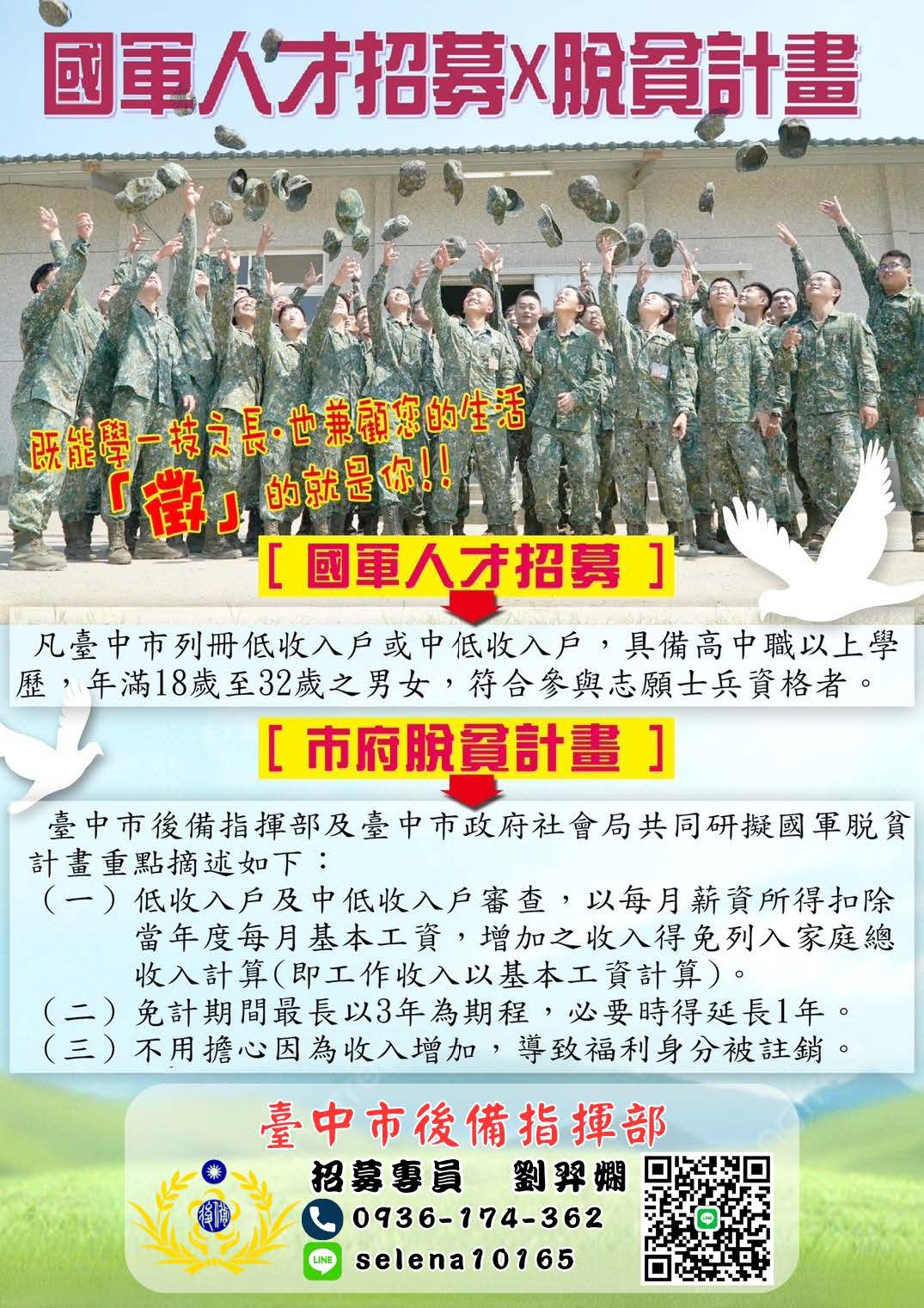(二)臺中市政府列冊低收入戶或中低收入戶符合參與志願役資格者。