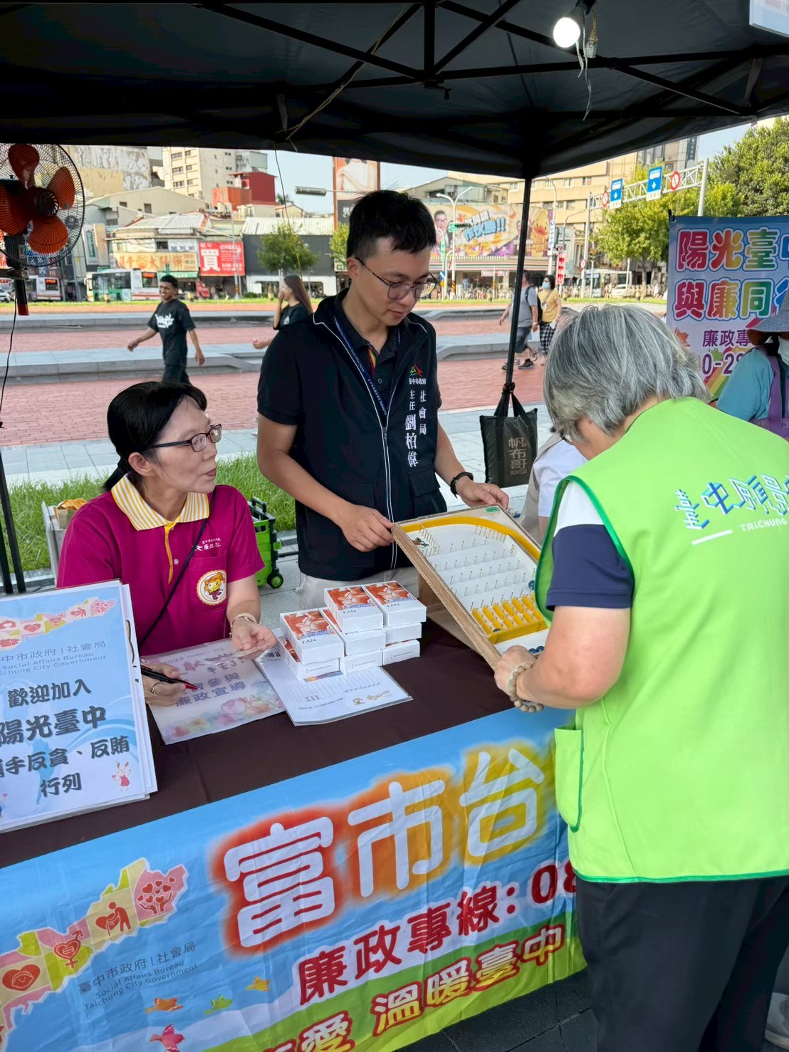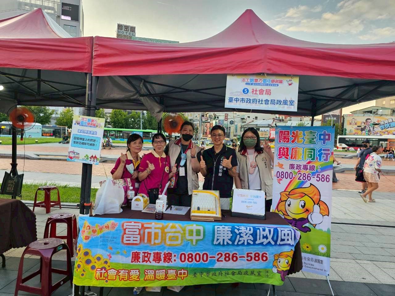 台中市政府社會局於台中火車站前廣場舉辦「志工銀響力,台中更美麗」志願服務大型宣導活動,邀請1200位不同領域的志工夥伴交流互動,以及10組高齡志工團隊表演精彩歌舞,阿公阿嬤級的志工活力十足,成為台上台下最有「銀」響力的閃亮之星。社會局政風室也於活動現場設置攤位,透過廉政問答結合彈珠台遊戲,進行廉政宣導活動。