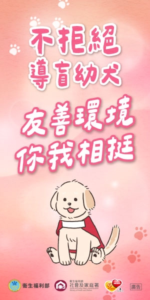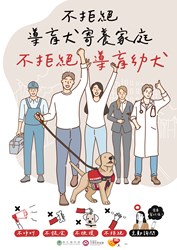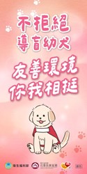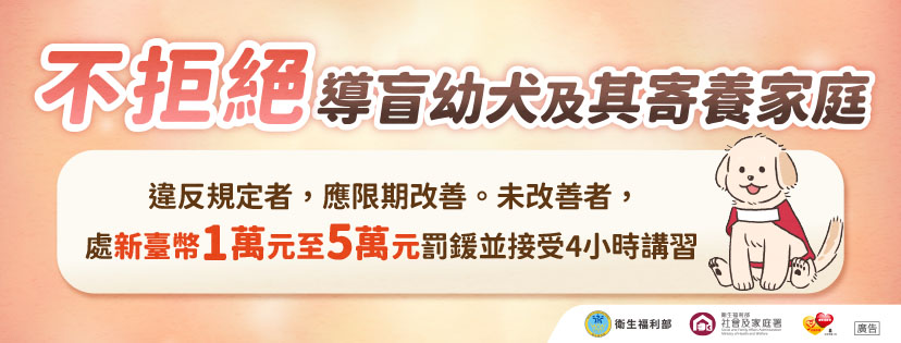 (二)為提升社會大眾對於導盲幼犬的認識,並支持導盲幼犬進入公共空間,及加強宣導「不餵食、不撫摸、不呼叫、不拒絕、主動詢問」觀念,衛生福利部社會及家庭署製作宣導影片及橫幅。