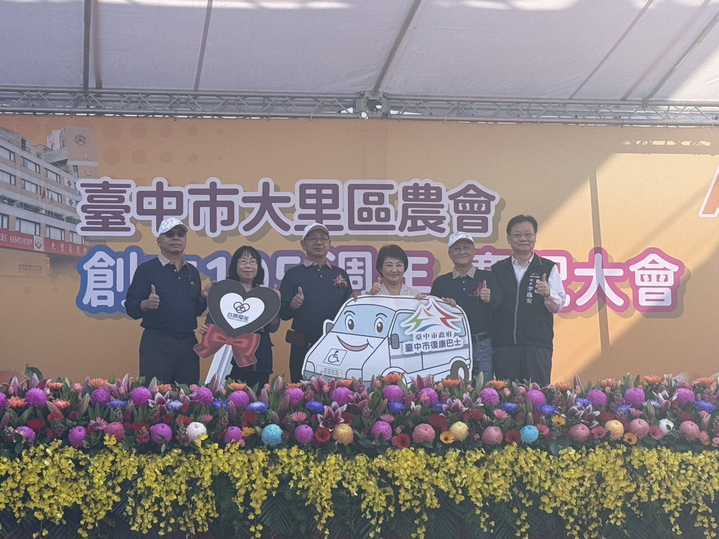 大里區農會表示,為達到「取之社會、用之社會」,秉持關懷社會的精神及回饋社會的初衷,特別在105週年慶祝大會活動會場捐贈復康巴士,希望身心障礙朋友們有溫馨接送、暢行無礙的交通服務。